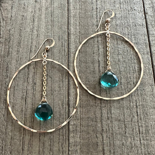 14K Gold Filled Hammered Hoop Earrings with Aqua Quartz Stones on Chain