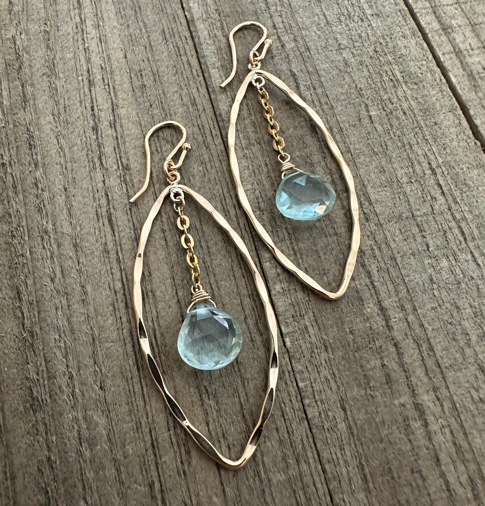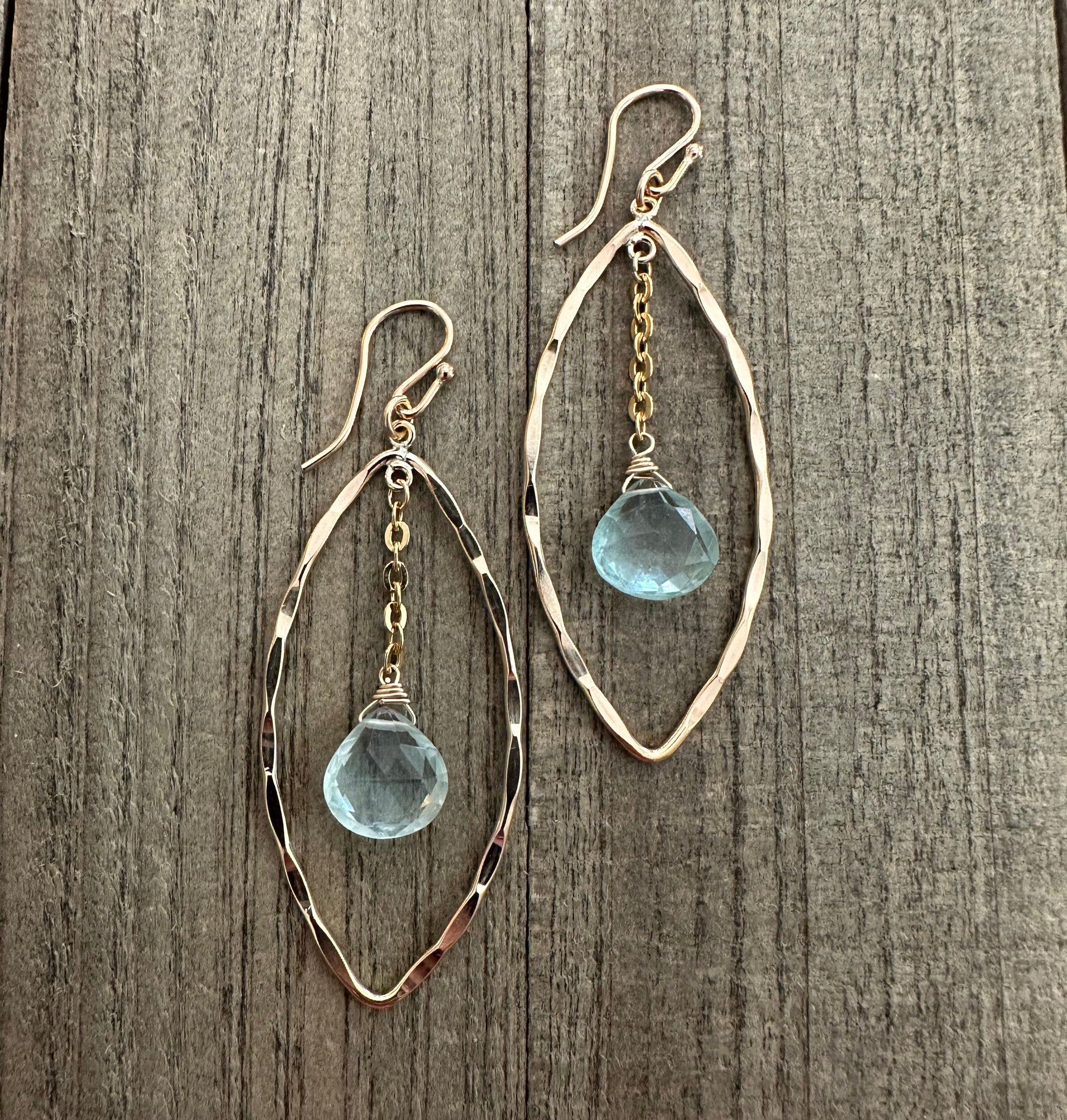 Stunning faceted aqua blue quartz stones dangle gracefully from elegant 14K gold filled marquis hoops. The rich teal-blue color of the quartz catches the light beautifully, creating gorgeous sparkle with every movement.