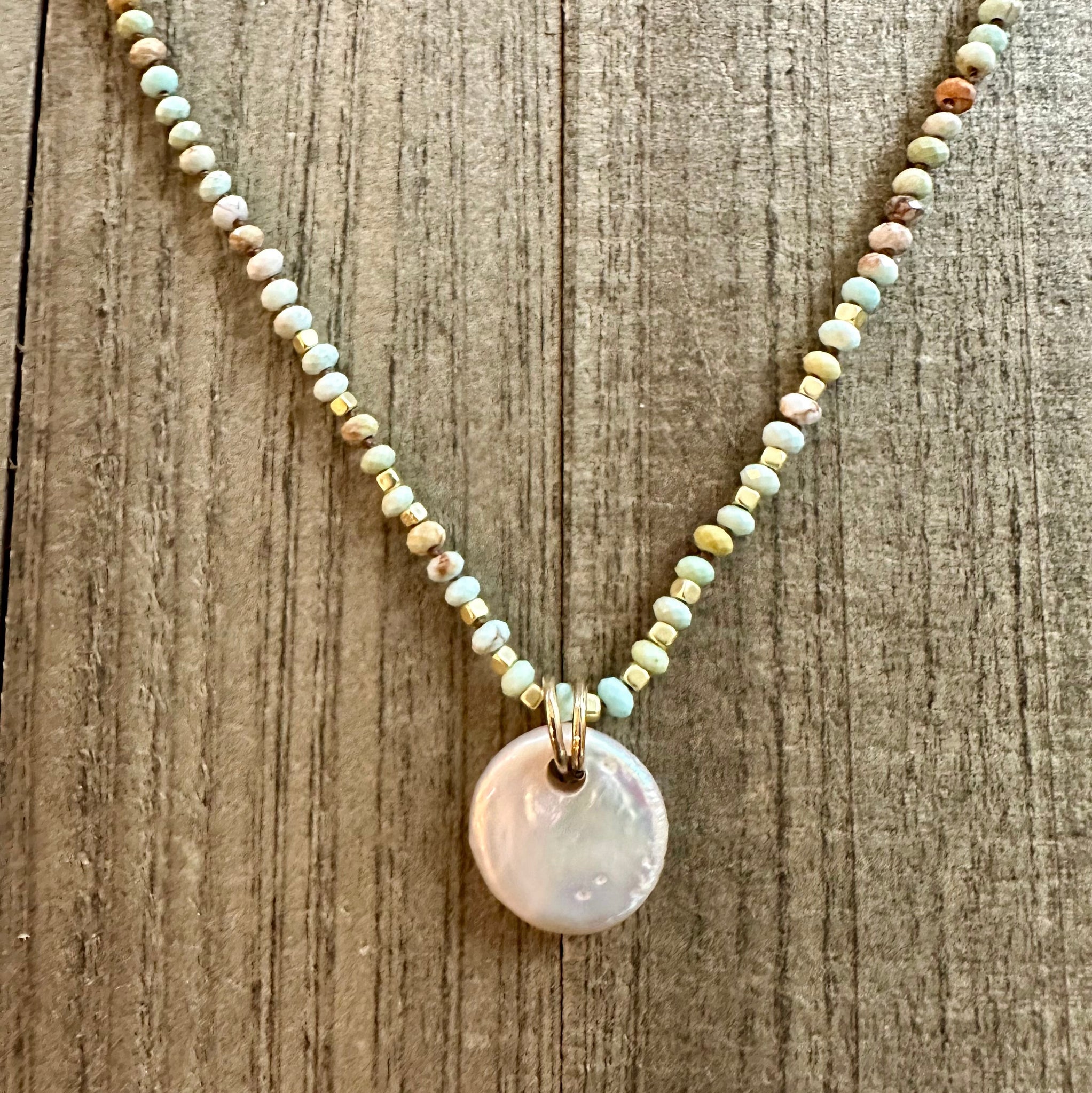 This beautiful knotted necklace features soft pastel dyed magnesite stones hand-knotted on sturdy nylon cord with a gorgeous freshwater pearl pendant. The mix of creamy whites, soft blues, and peachy tones creates the perfect beachy, bohemian vibe.