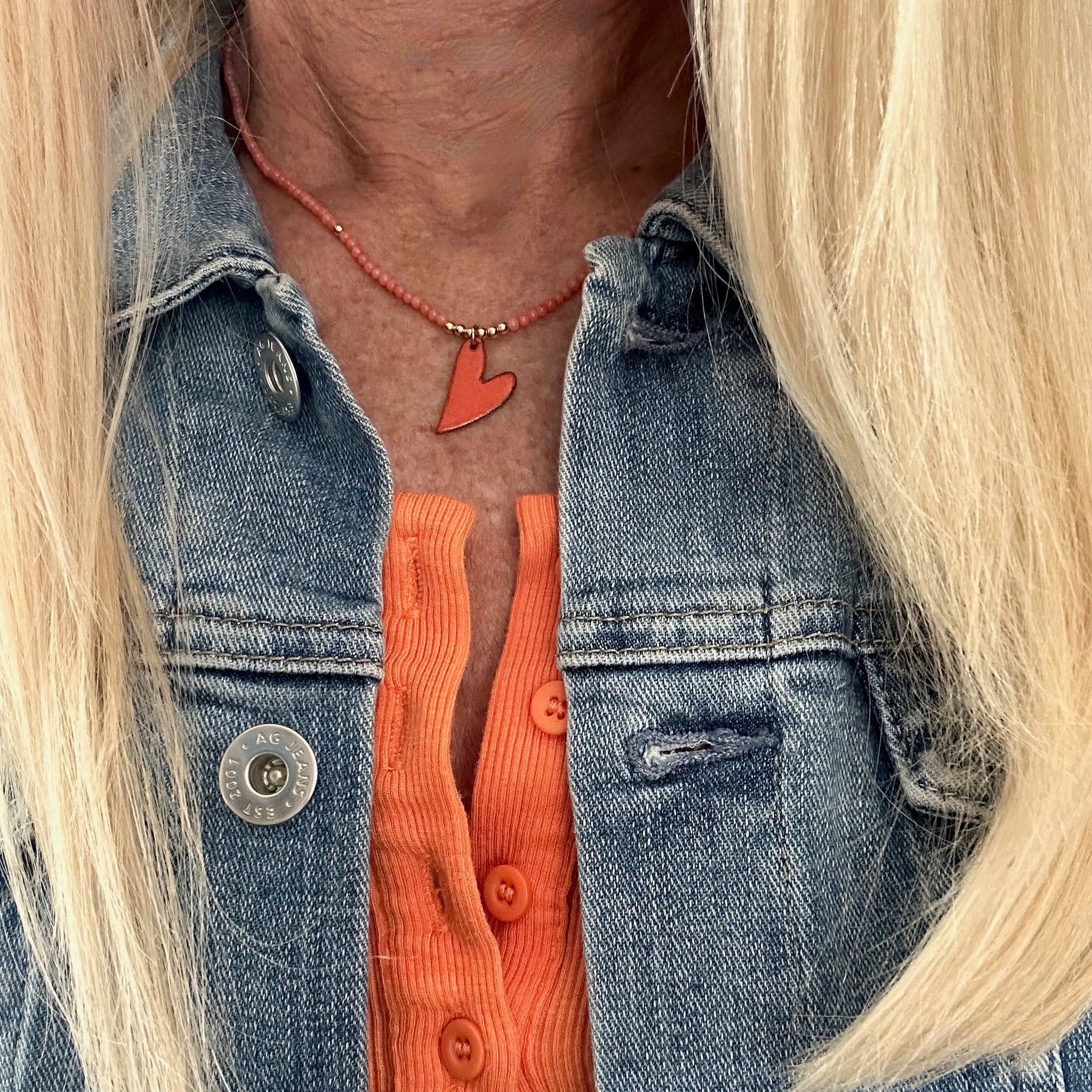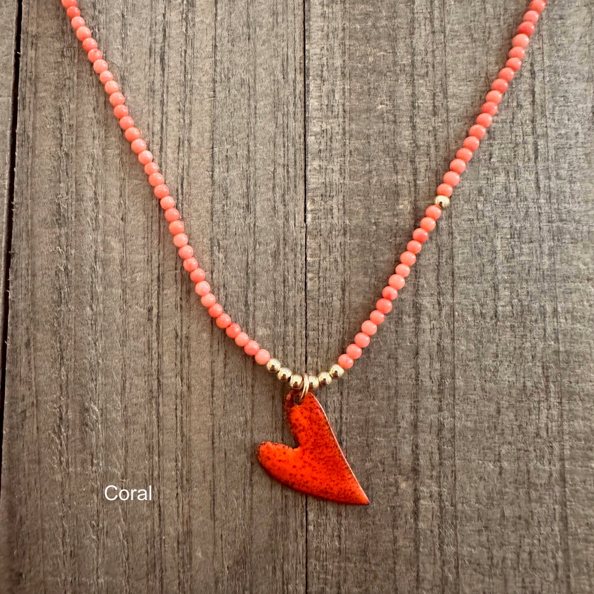 Part of the Love Out Loud Collection, this necklace features genuine coral beads strung on nylon cord, anchored by a vibrant hand-crafted enamel heart pendant in a fiery orange-red. Coral and enamel together — it's a summer sunset you can wear.
