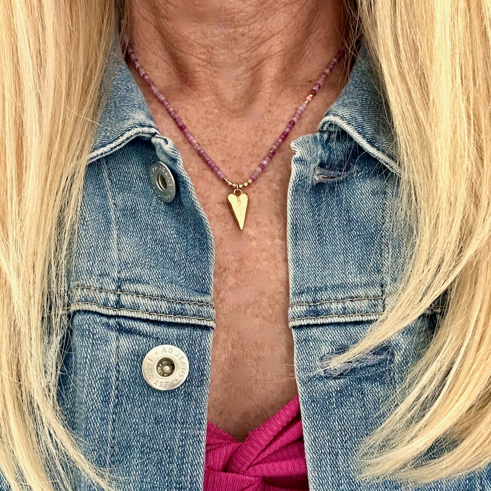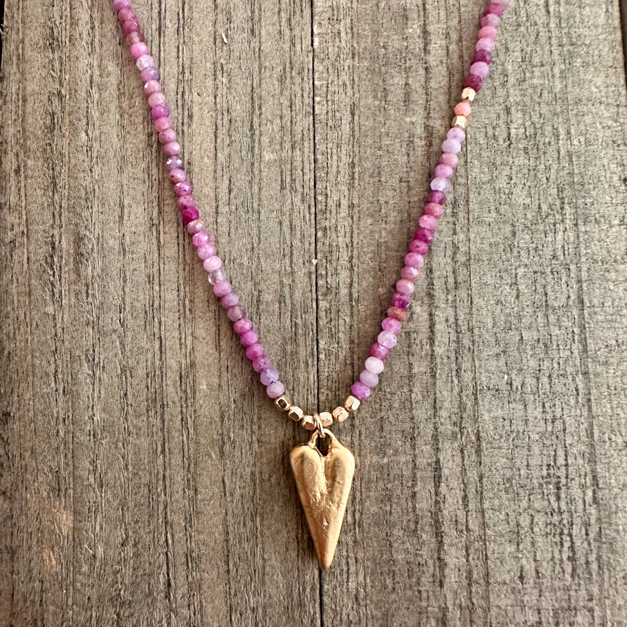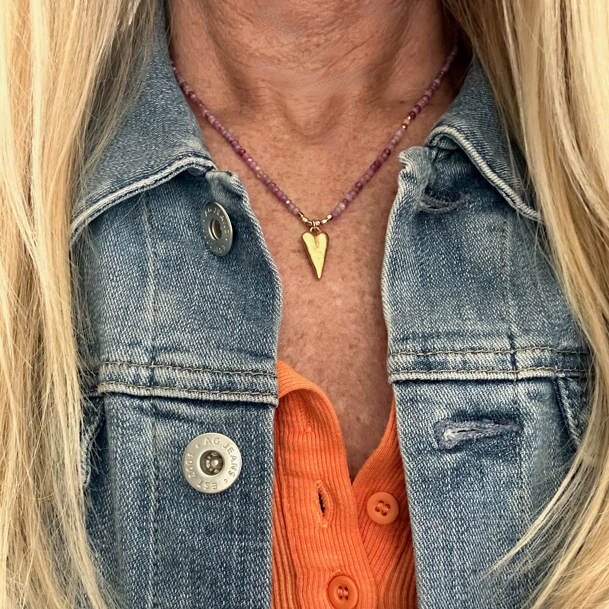 Part of the Love Out Loud Collection, this necklace features a full strand of genuine ruby beads strung on beige-taupe nylon cord, anchored by a substantial brushed 18k vermeil heart pendant. This heart has real weight to it — you'll feel it when you wear it, in the best possible way.