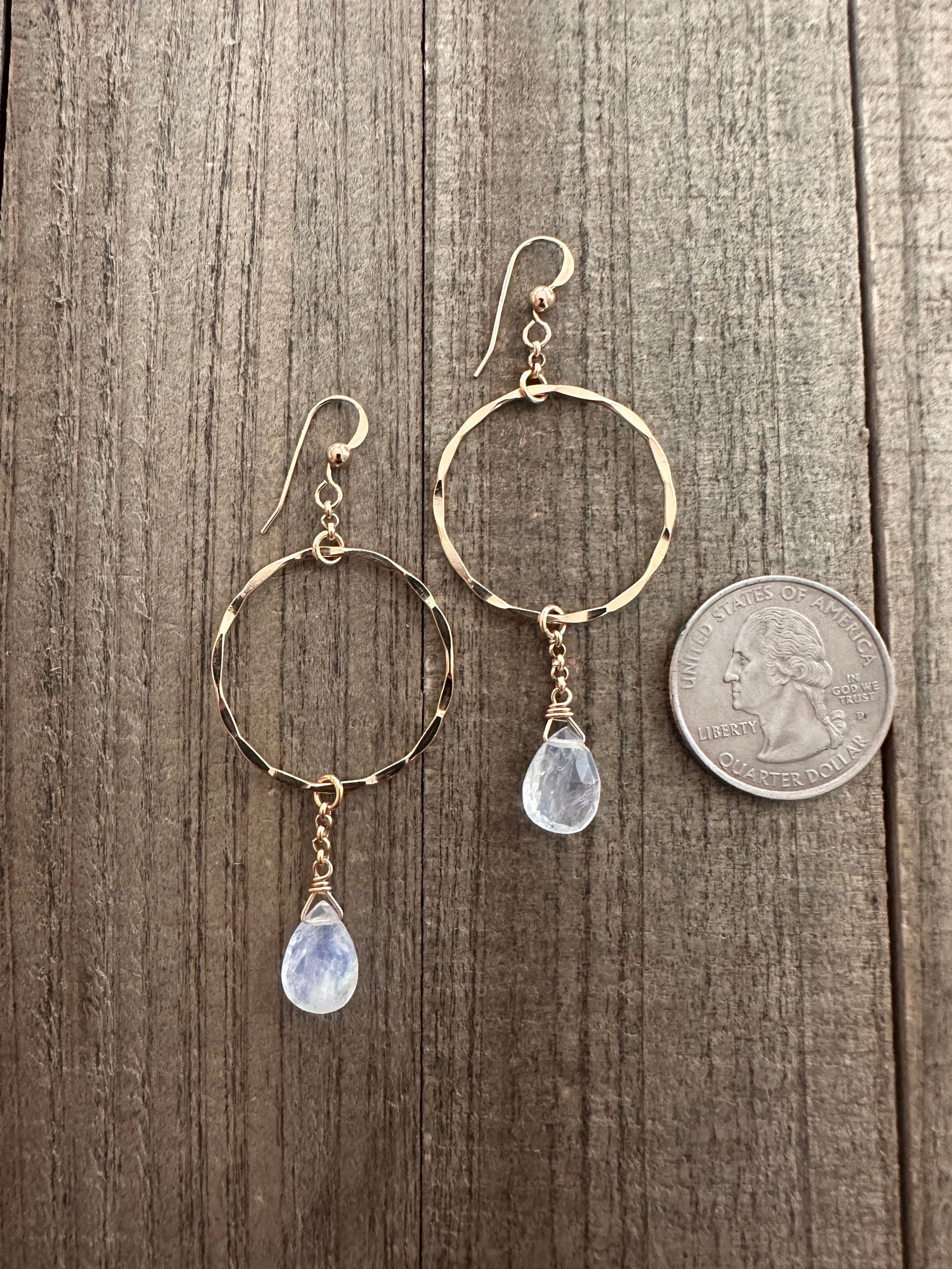 14K gold filled hammered hoop, chain, and ear wires. Genuine moonstone briolette.
