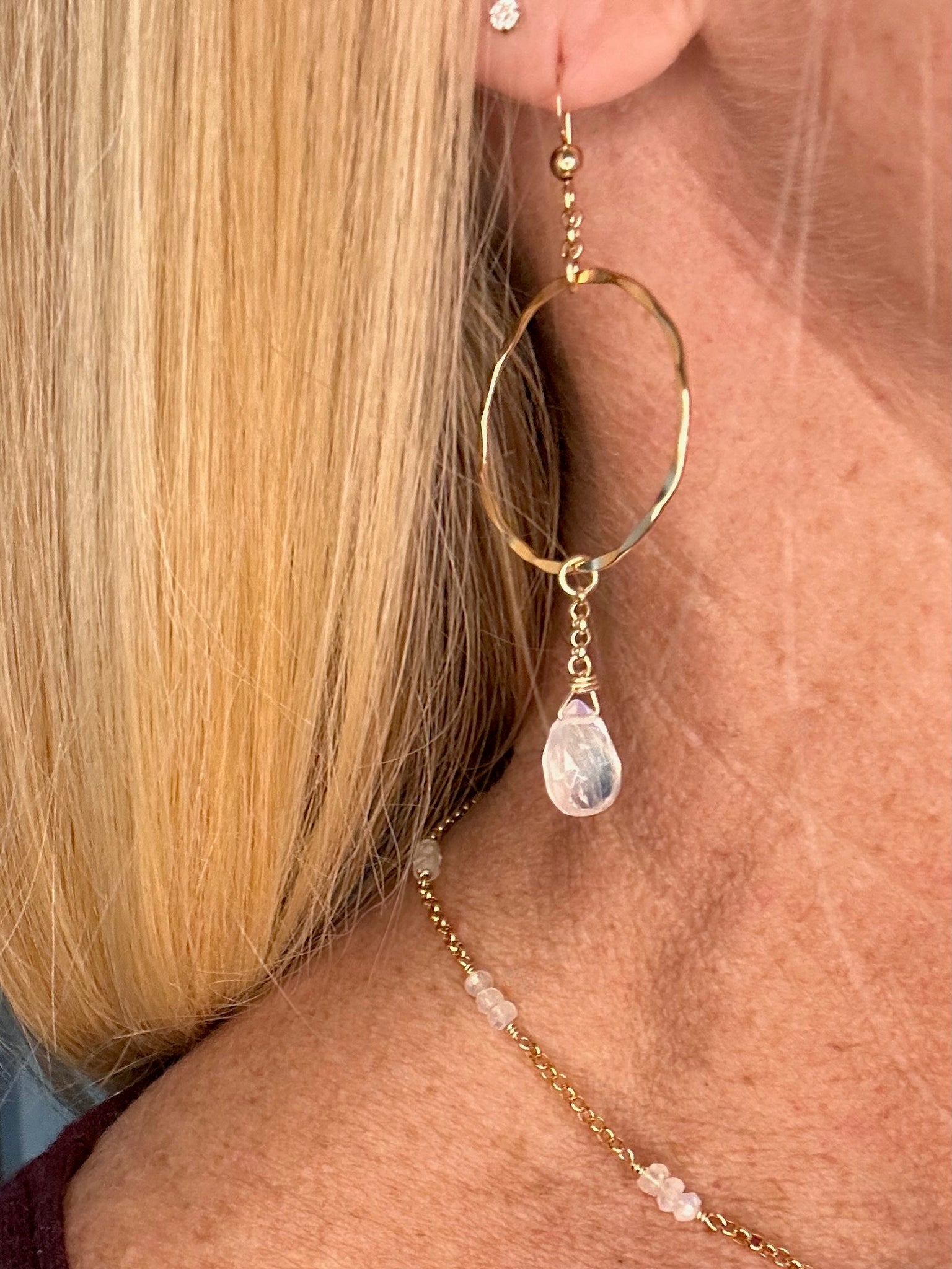 A glowing moonstone briolette suspended on a delicate gold chain inside a hammered 14K gold filled hoop — luminous, feminine, and endlessly wearable. These move beautifully. Total drop 2.5”.