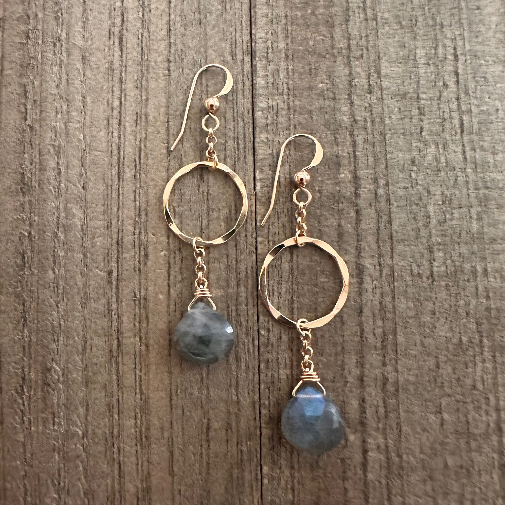 14K gold filled hammered hoop, chain, and ear wires. Genuine labradorite briolette. Finished with Haley Kelly’s signature gold tag.