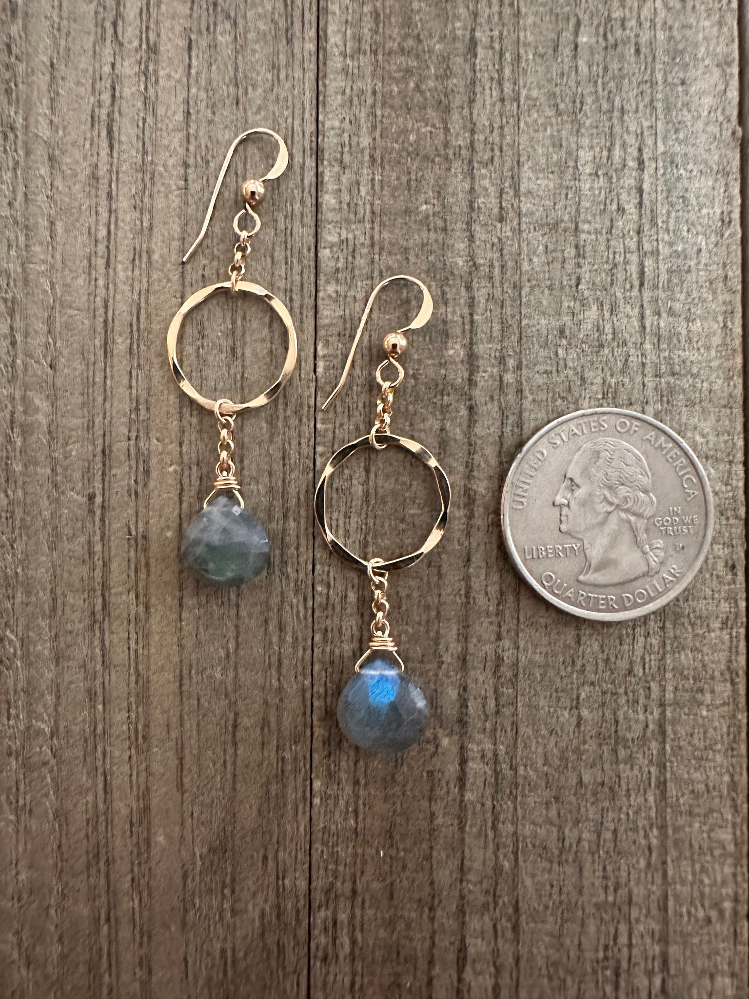 A faceted labradorite briolette suspended on a delicate gold chain beneath a hammered 14K gold filled hoop — moody, magical, and completely captivating. That flash of electric blue catches light with every move. Total drop 2”.
