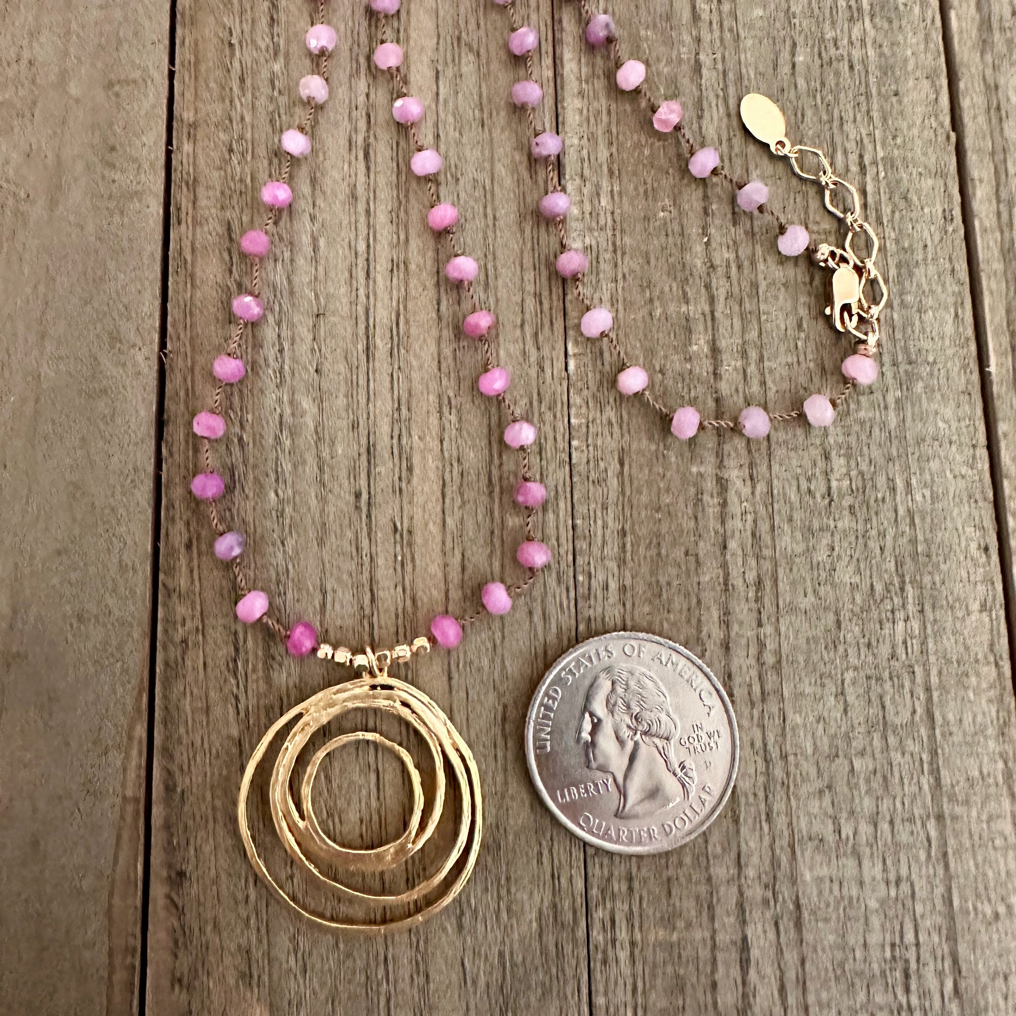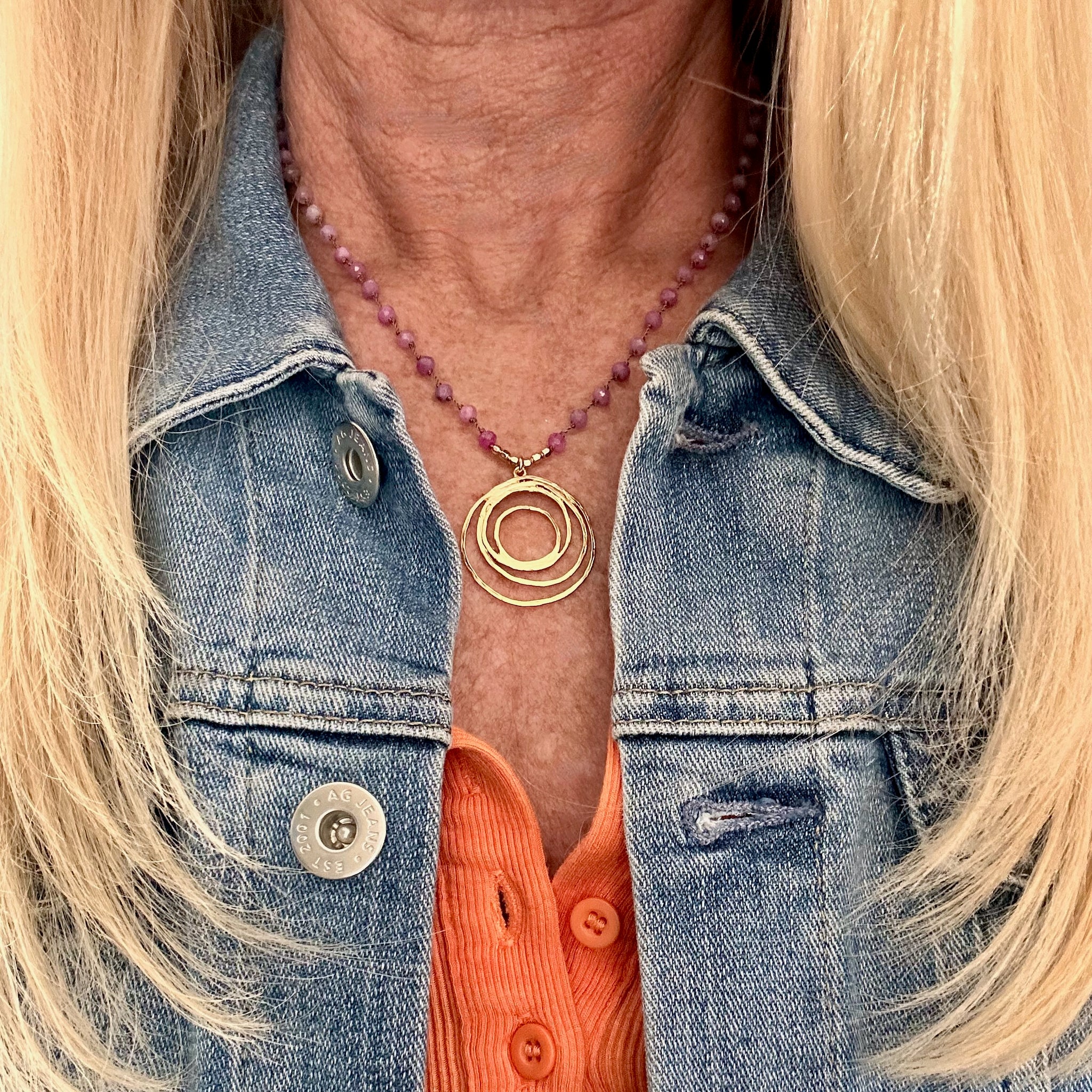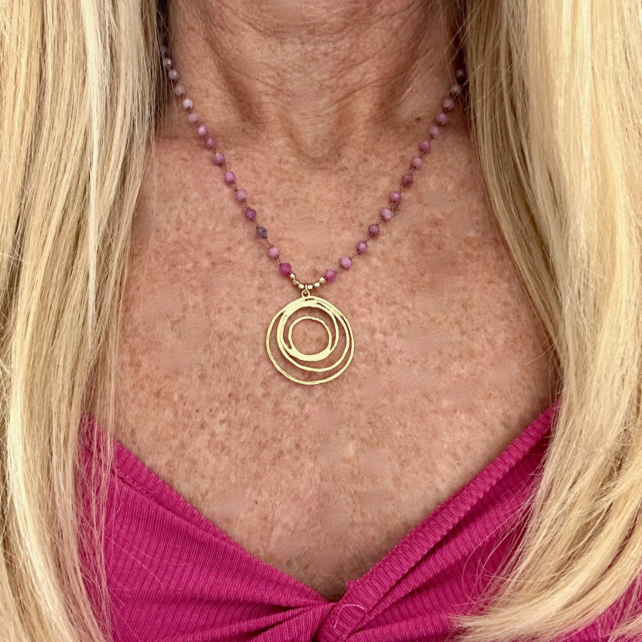 Part of the Love Out Loud Collection, this hand-knotted necklace features genuine ruby beads in a warm beige-taupe nylon cord — each bead individually knotted by hand — anchored by a stunning hammered 18k vermeil multi-circle pendant. Vermeil means 18k gold over sterling silver, so you're getting real precious metal with serious staying power.