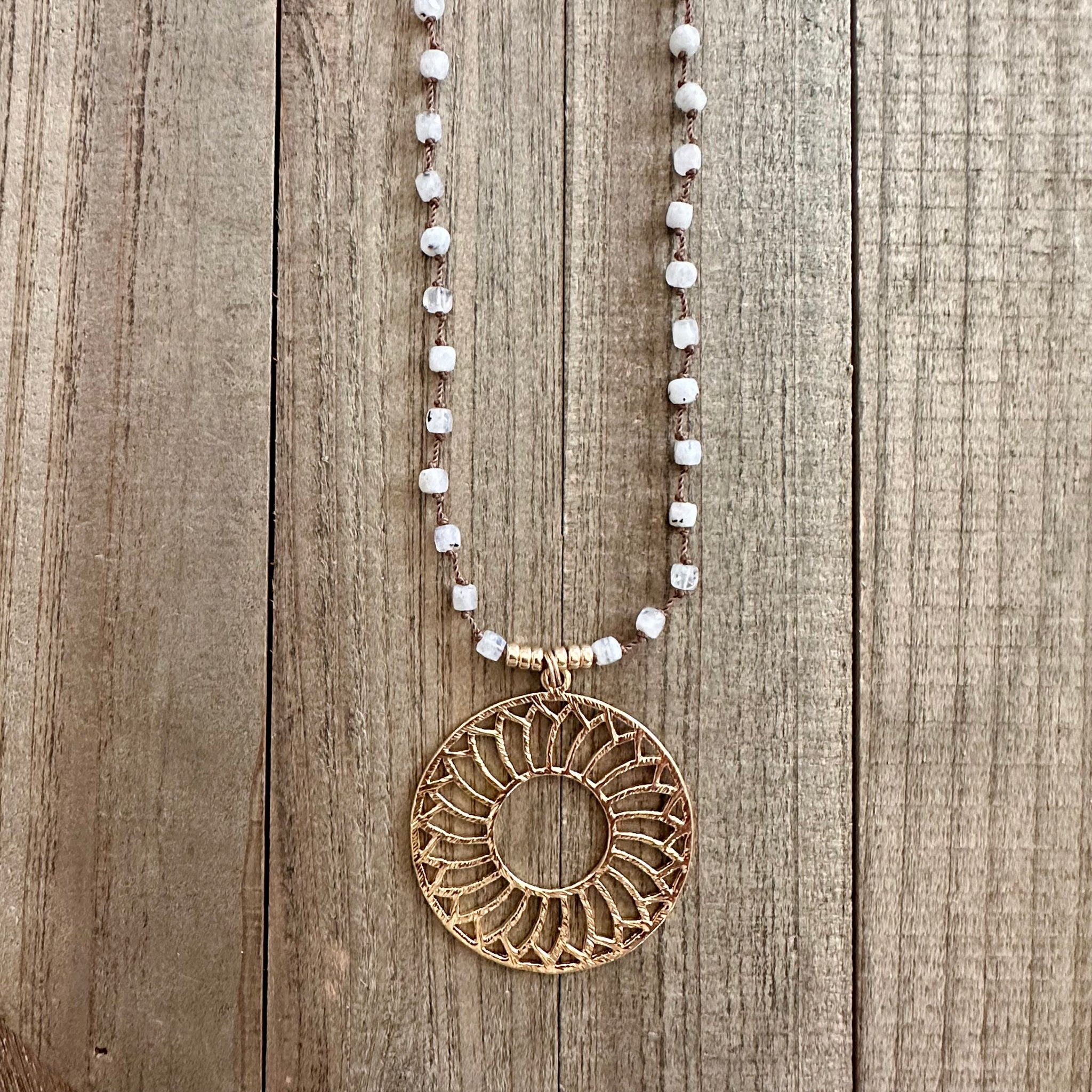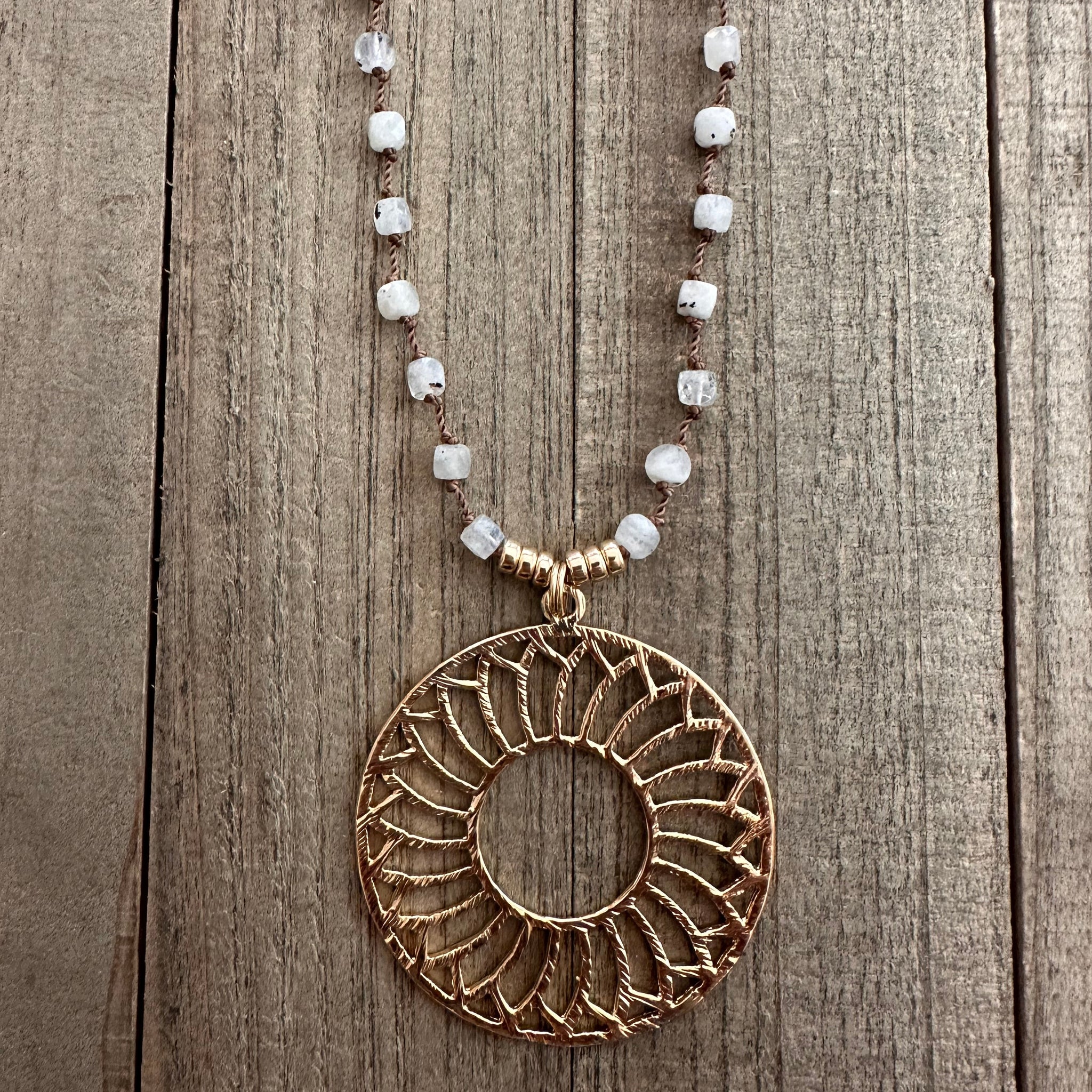 Genuine moonstone. Beige nylon cord. 14K gold filled rondelle accents. 24k gold plated brass sun wheel pendant. Finished with Haley Kelly’s signature gold tag.
