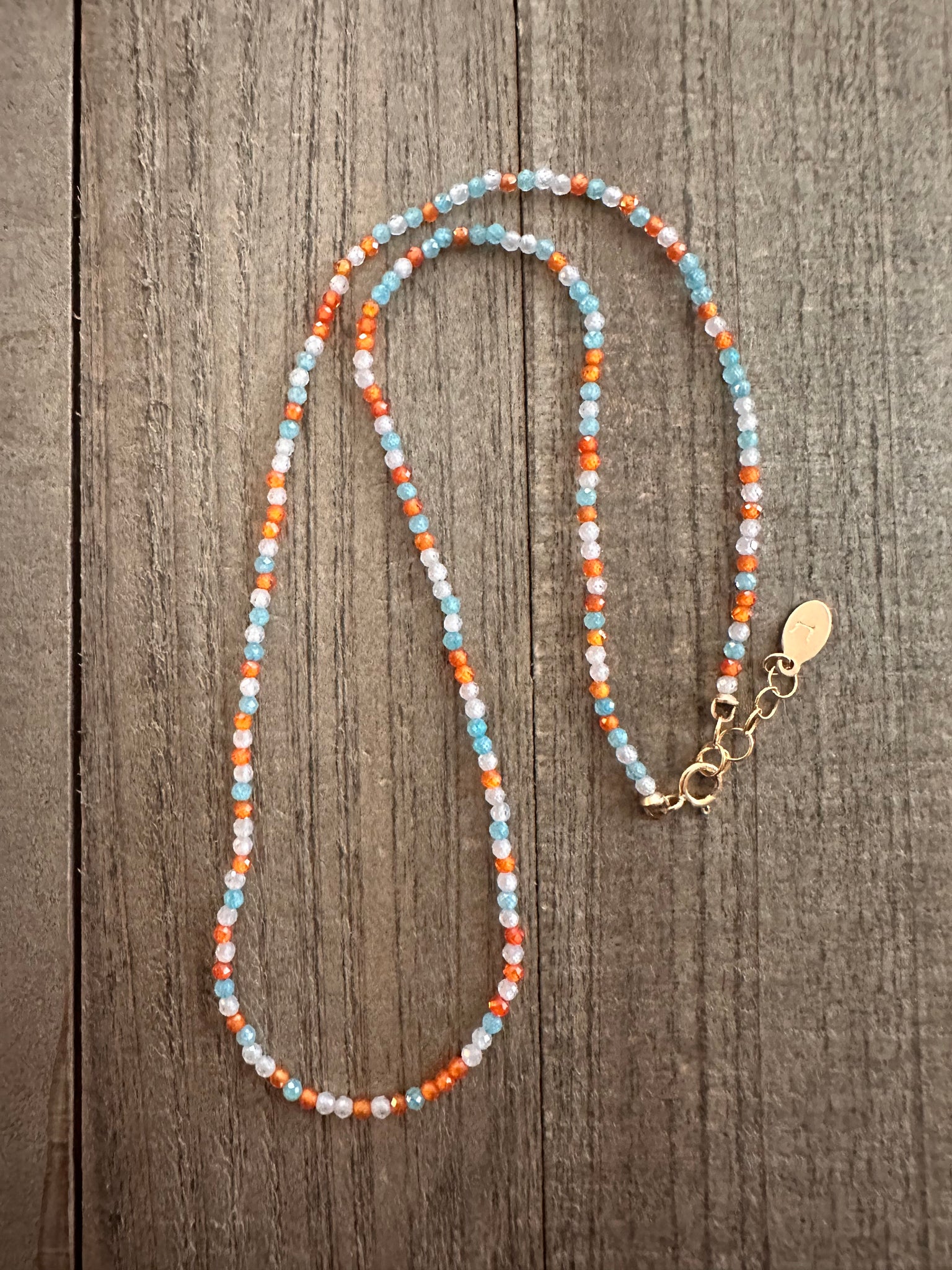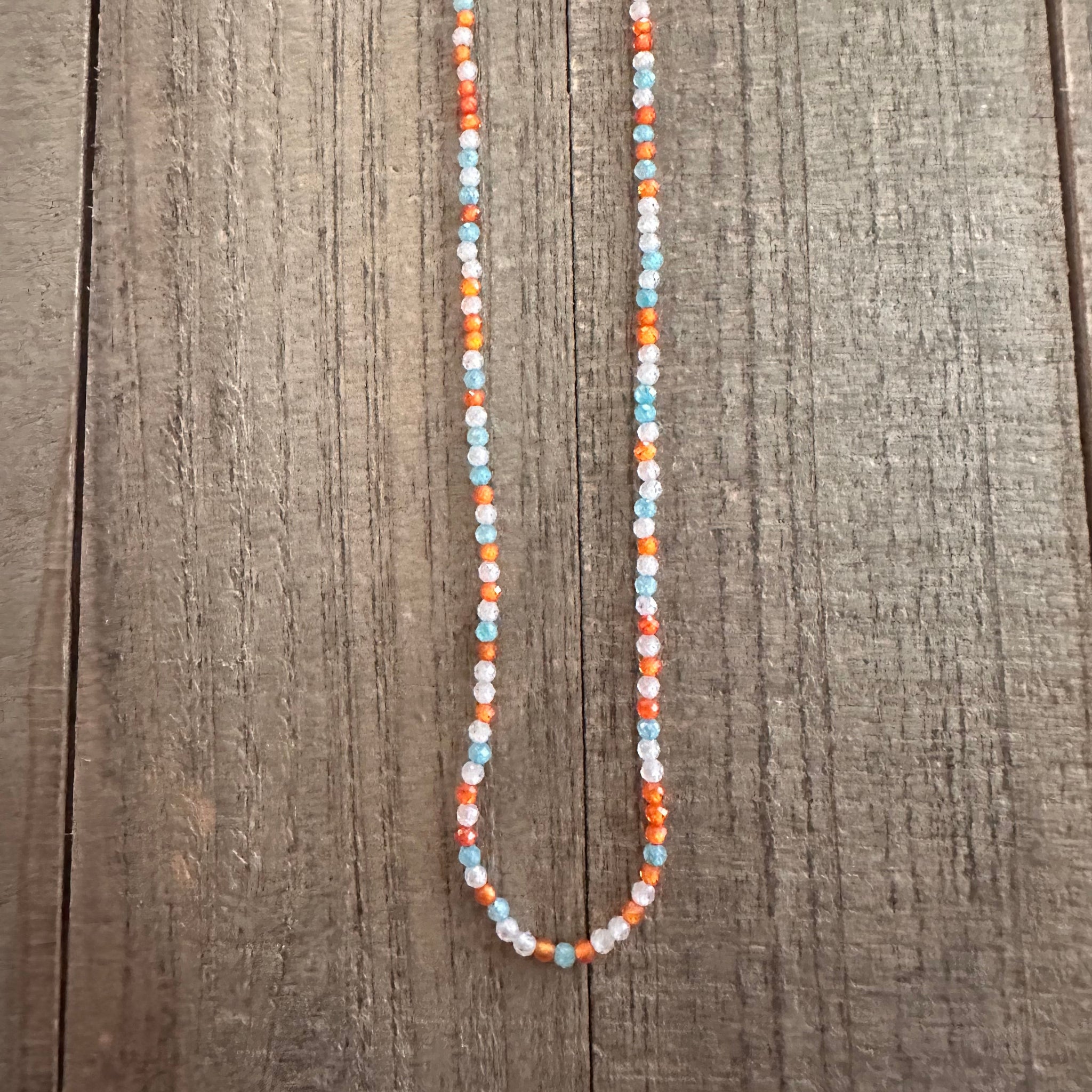 The one that started it all. Teal, orange, and clear CZ crystals sparkle together in this effortless everyday choker. Beachy, bright, and made to stack. Adjustable 15–16” with 14K gold filled findings.— Haley