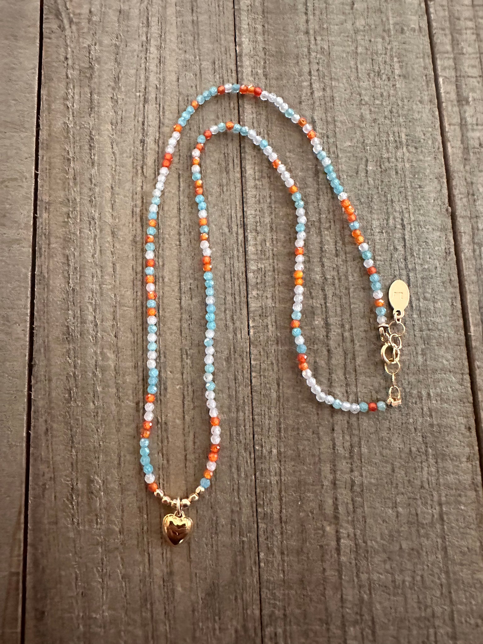 Same playful teal, orange, and clear CZ crystals as our Sun & Sea Choker — this time finished with a dainty puffy 14K gold filled heart at the center.