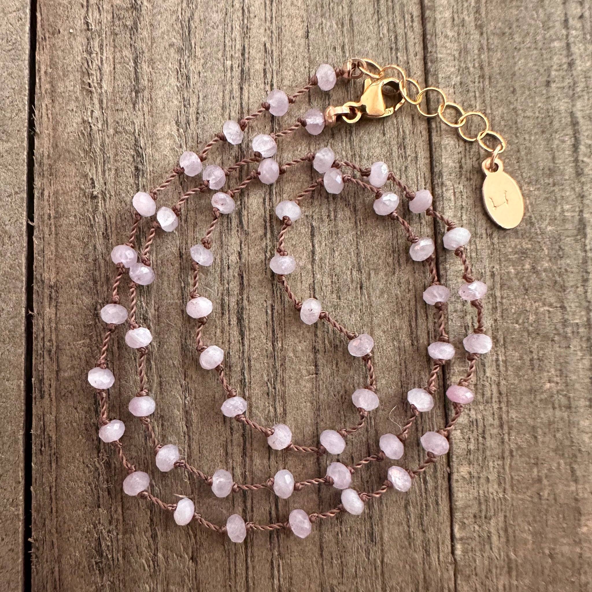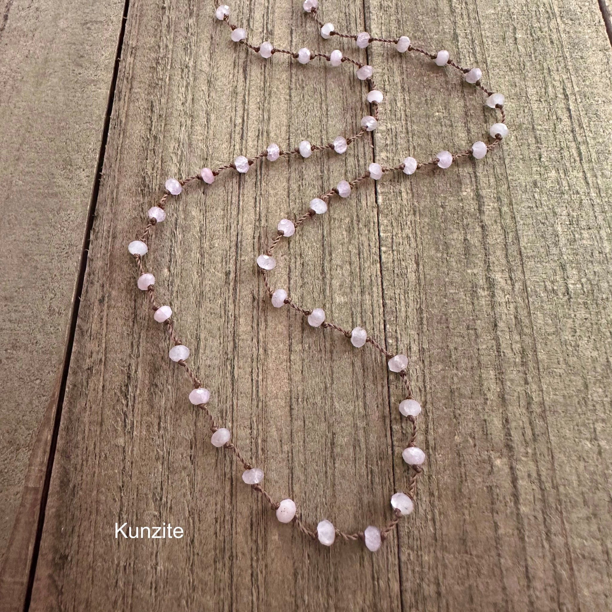 - Genuine kunzite beads, hand-knotted on beige-taupe nylon cord