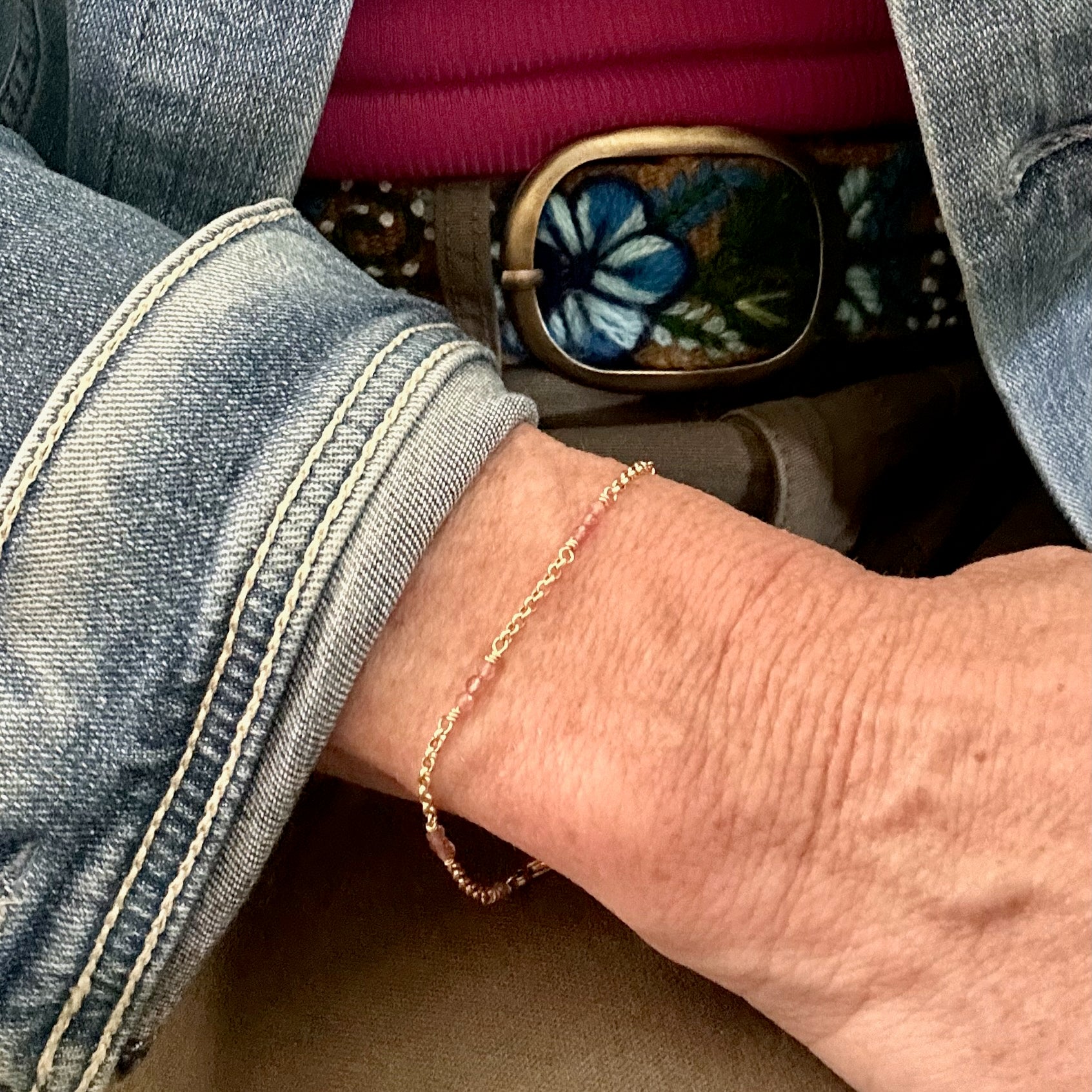 Part of the Love Out Loud Collection, this hand-wired bracelet features genuine pink tourmaline beads scattered along a chunky 14K gold filled chain. The contrast between the dainty stones and the substantial chain is what makes this piece so good.