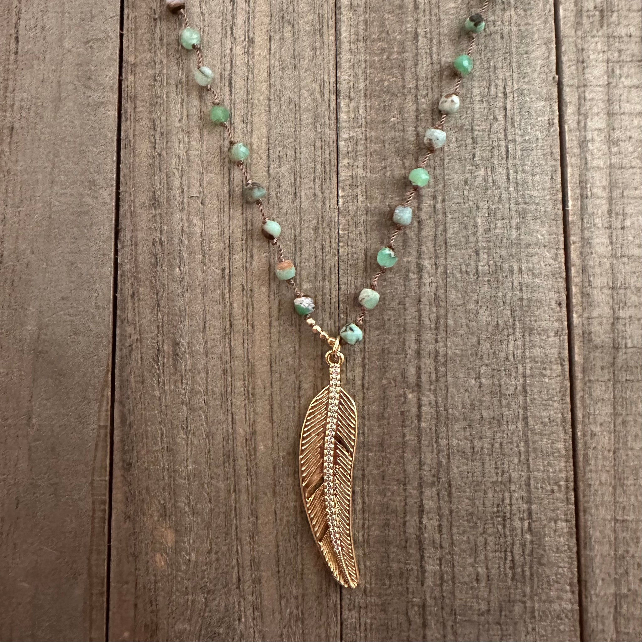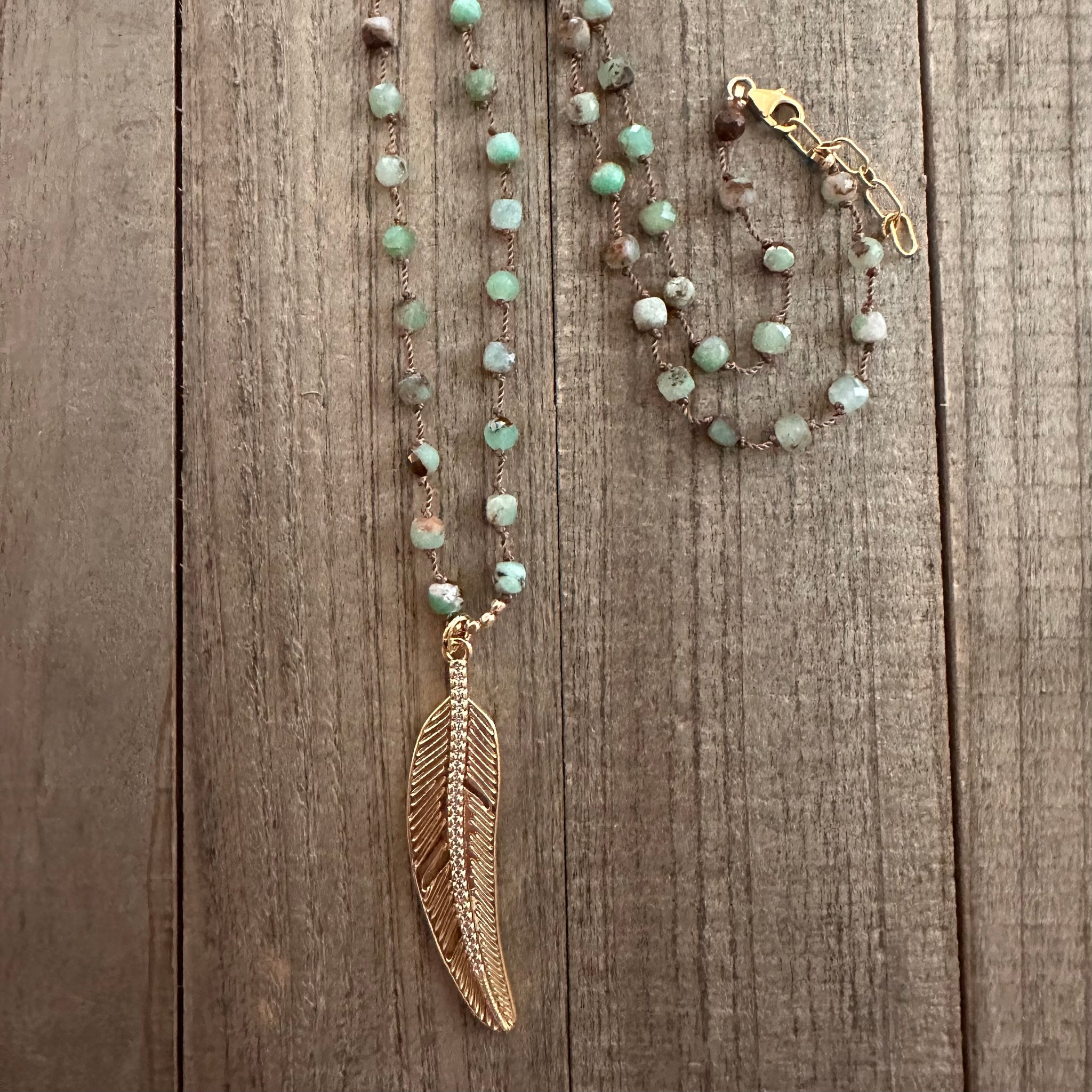 Faceted chrysoprase beads hand-knotted on dark cord, anchored by a detailed 14K gold filled feather pendant — earthy, bohemian, and completely free. That soft sage green of chrysoprase against the gold is quietly stunning. Sits at 18”–19”.