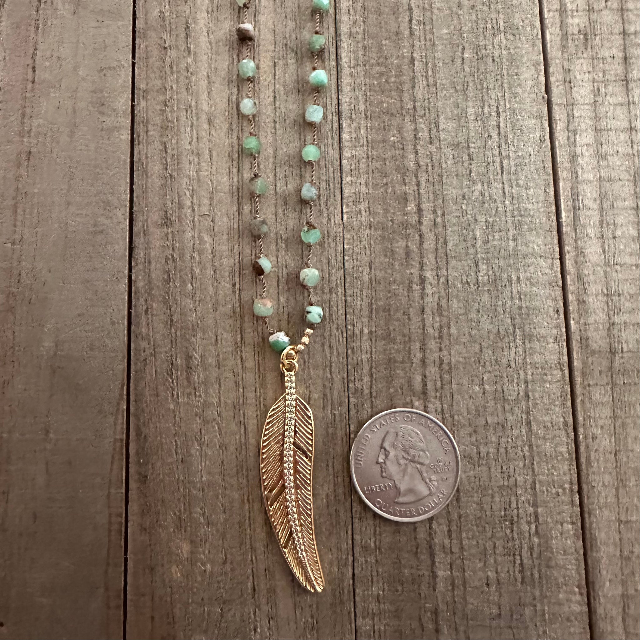 Genuine chrysoprase. Dark nylon cord. 14K gold filled feather pendant, lobster clasp, and findings. Finished with Haley Kelly’s signature gold tag.