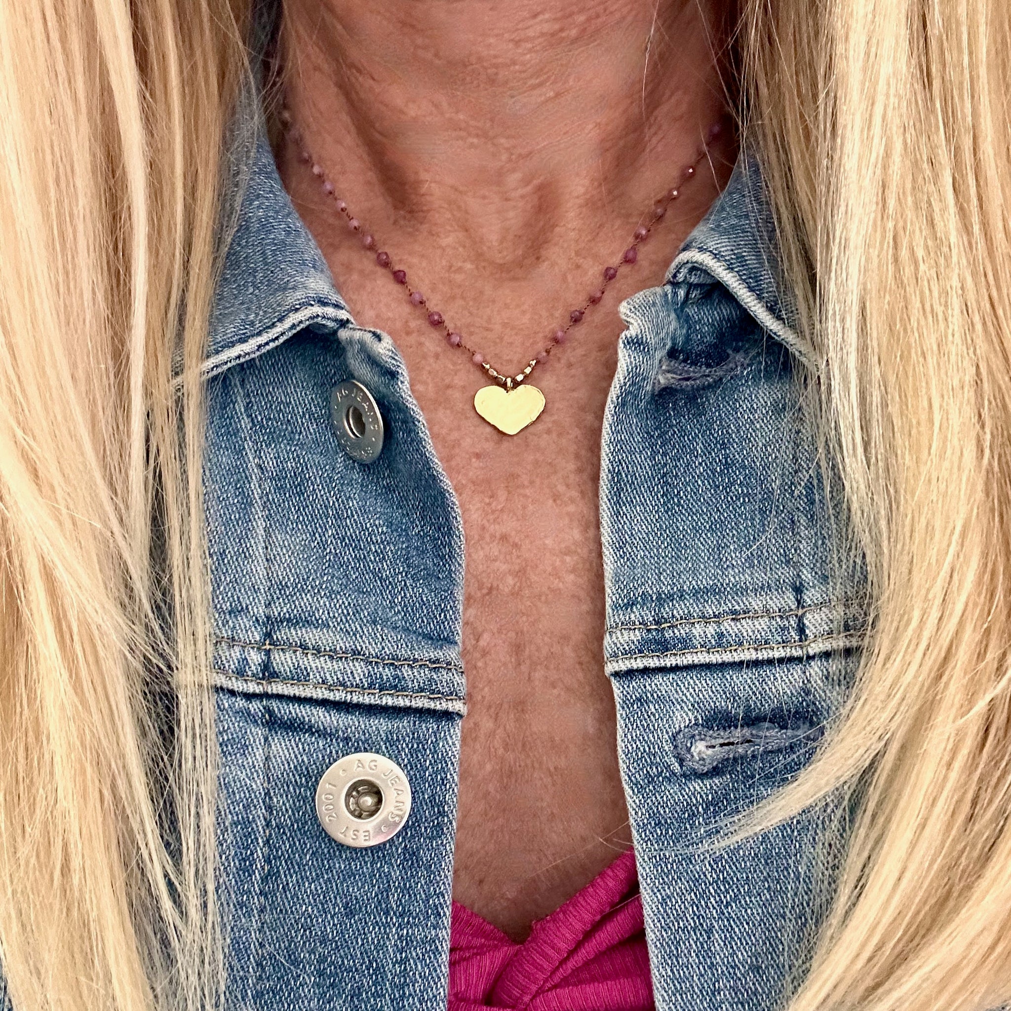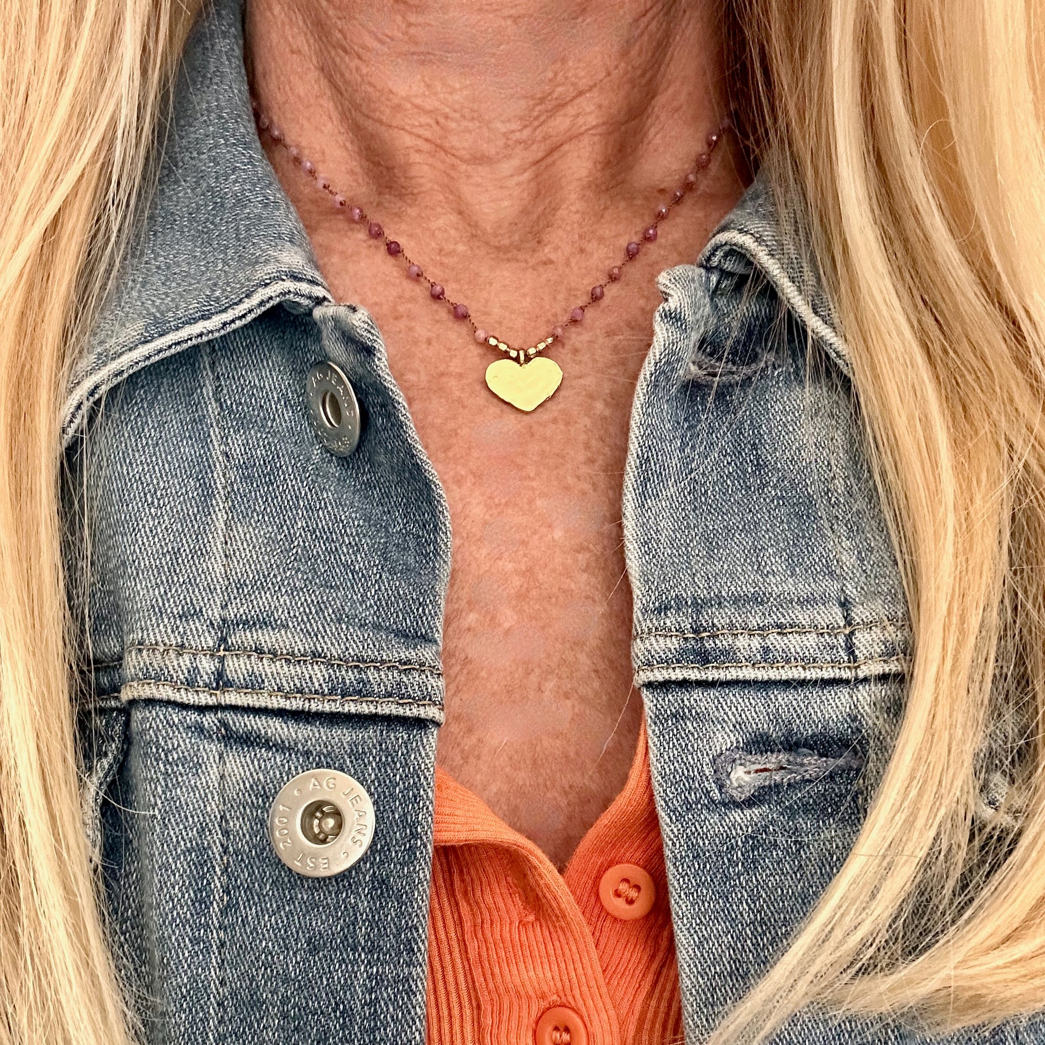 Part of the Love Out Loud Collection, this hand-knotted necklace features genuine ruby beads individually knotted on beige-taupe nylon cord, centered around a brushed 18k vermeil heart pendant. Vermeil means 18k gold over sterling silver — real precious metal with beautiful warmth and staying power.